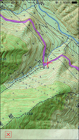 トラック詳細画面で「地図で見る」をタップすると地図表示画面になります。関連付けされた地図が表示されて、そこにトラックが描画されます。左の写真の紫色の線がそれです。 トラック詳細画面の「地図で見る」ボタンを押した場合は、単に紫の線でトラックが描かれるだけですが、各トラックポイントの行をタップした場合は赤い十字でそのトラックポイントが示されます。変に座標が飛んじゃったトラックポイントを削除したい場合はこの機能で探すと良いと思います(本格的な編集はパソコンでやった方が良いと思いますが)。 |