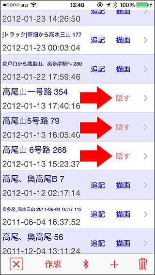 描画ボタンを押すと、そのトラックをメイン画面の地図上に描画します。トラックをインポートしてそれを地図に表示すれば歩くときの道しるべになります。 描画ボタン(トラックが非表示状態の時に描画ボタンになる) 隠すボタン(トラックが表示状態の時に隠すボタンになる) |