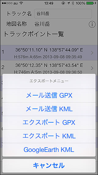 トラックをGPX形式、またはKML形式のファイルでメールに添付したり、外部アプリに送る事が出来ます。Dropboxに送ればパソコンと同期させるもの簡単です。 送った各ファイルは、KMLならGoogleEarthで、GPXならカシミール3Dやヤマレコで使えます。パソコンに送ればトラックデータ編集ツールもありますので、ズレた座標の編集や削除などが出来ます。 なお、iPhoneのGoogleEarthはファイル名に日本語が入っていると開けないという不具合(仕様?2013年11月現在)があります。その為、iPhoneのGoogleEarthでKMLファイルを開きたい場合は一番下の「GoogleEarthKML」をタップしてGoogleEarthを起動してください。パソコンのGoogleEarthは普通に上の「メール送信KML」か「エクスポートKML」で作られるKMLファイルを読み込めます。 [参考]GoogleEarth でGPSトラックデータを修正編集する ご注意…KML形式はトラックポイントの位置情報のみを連ねた形式なので、時間情報が残りません。各ポイントの記録時間を残したい場合はGPX形式でエクスポートして下さい。 |