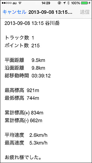 トラックをGPX形式、またはKML形式のファイルでメールに添付して送れます。 メール本文にはトラックの統計情報が入ります。ただ、GPSの誤差によるノイズも集計されるので累計標高や最高速度はおかしな値になるかも知れません。目安程度とお考え下さい。 特に、ログの記録間隔を5秒とか5mとか、極端に短い設定にした場合は記録するポイント数が増え、その分だけ誤差も多く集計されます。よって距離や累計標高などが多めに計算されます。比較的正しい数値を知りたい場合は、時間なら1分、距離なら80mなど適当な間隔を空けてログを取るようにして下さい。 平面距離はログの各トラックポイント間の距離を標高差なしで計算した合計距離です。沿面距離は標高差も含めた距離となっていますので、大抵は平面距離より少し長い距離になります。 |
