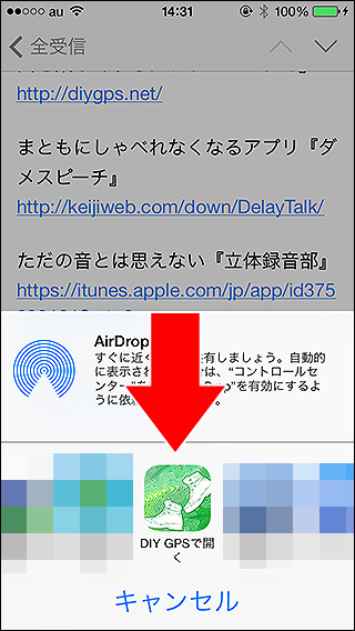 ![]() ファイルの関連付けでDIY GPSをタップしてください。 ![]() アプリ一覧にDIY GPSが無い場合は『このアプリで開く...』をタップしてください。 |