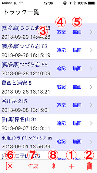 GPSロガー機能で記録したログをトラックと呼びます。トラックは複数の経緯度情報(トラックポイント)からなる線の情報です。この画面では、そのトラックの管理を行えます。 1.新規トラックボタン ※iPhoneの設定『Appのバックグラウンド更新』がオフの場合はGPSログの機能は使えません。使いたい場合は『設定->一般->Appのバックグラウンド更新』をオンにして下さい(全体、アプリ個別ともに)。 2.削除ボタン 3.トラック一覧 4.追記ボタン 5.描画ボタン 6.×ボタン 7.ソートボタン(使用、作成、名前) 8.Bluetoothボタン(受信側) |