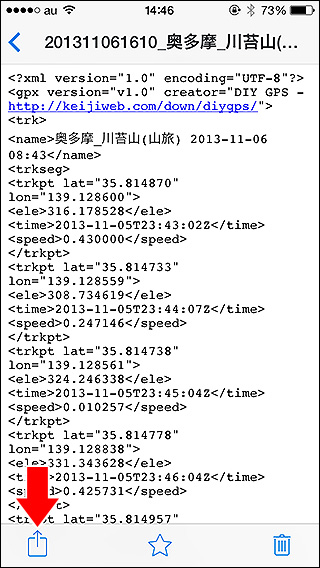 ![]() GPXファイルの中身はこんな感じ。Dropboxで開いた状態。左下のエクスポートボタンを押してください。 |