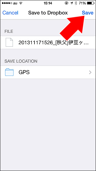 ![]() Dropboxが起動したらこんな画面になります。「Save」をタップするとアップロードされます。 |