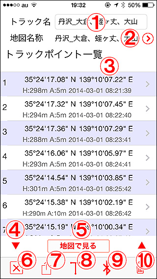 トラック一覧画面でトラックの名前の辺りをタップすると詳細画面になります。 1.トラック名 2.地図名称 3.トラックポイント一覧 4.ジャンプ 5.地図で見る 6.×ボタン 7.エクスポートボタン 8.トラック情報ボタン 9.Bluetoothボタン(送信側) 10.削除モード |