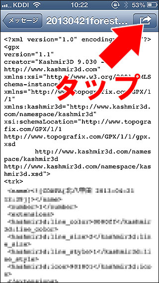 メールに添付されたGPXファイルをインポートする方法を説明します。 GPXが添付されたメールをiPhoneのメールアプリで開くと、左の画像の様にGPXファイルが添付されています。 ファイルをタップすると対応しているアプリの一覧が表示されます(左下の画像)。DIY GPSをタップしてください。GPXファイルがDIY GPSに送られて、インポート処理が始まります。あとは他の方法と同じです。 メールの送り方(おそらくHTMLメールの場合)によっては、下の画像の様にGPXファイルの中身が表示される事があります(GPXファイルの実体はただのテキストファイルです)。 この場合は、右上にあるエクスポートボタンを押すと対応アプリ一覧が表示されますので、DIY GPSをタップしてください。DIY GPSのGPXファイルインポート処理に進みます。 |