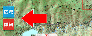 広域/詳細地図切替 オンにすると、条件に合う地図があればメイン地図の左下に切り替えようのボタンが表示されます。それぞれのボタンを押すことで地図の切替が出来ます。