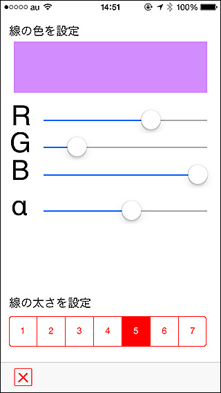 GPSログの線の色、太さ、透明度を変更できます。右の矢印ボタンや行自体をタップすると設定画面が開きます。RGBのスライダーを動かして色を、αのスライダーで透明度を変えられます。変更は画面上部の四角形に反映されます。太さは7種類から選んで下さい。