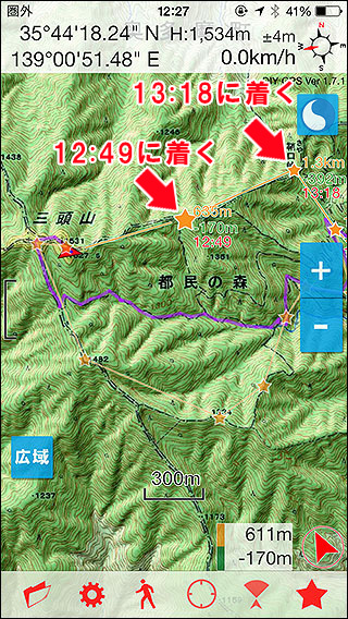 歩行速度の設定を『遅め』にして休憩時間も『普通』にすると到着時間が後ろにずれます。歩行スピードを『普通』で計算した場合に比べて40分ほど多く掛かる計算です。 |