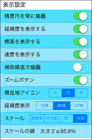 メイン画面に距離の目安を表示します。非表示、グリッド、円、単線の4つから選べるので好きなスケールを表示してください。