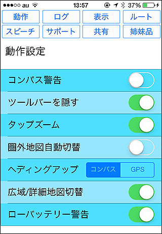 現在地の矢印アイコンの向き、ヘディングアップ(自分が向いている方向で地図が回転する)をコンパスとGPSコースのどちらに連動させるかの設定です。デフォルトはコンパスです。GPSにすると、少し前にいた場所から現在地までの角度を計算して現在地アイコンの向きを設定します。デフォルトはコンパスで、コンパスの場合は電子コンパスに連動して現在地アイコンの向きが変わります。