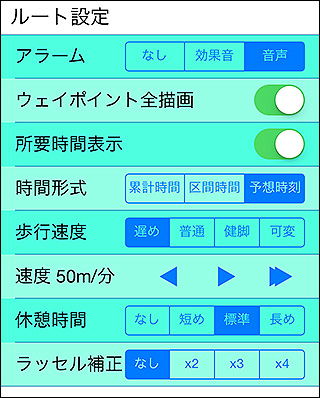 所要時間を計算するための基準となる歩行速度を指定します。パーティーの人数が多かったり雪深かったりする場合は遅め(分速50m)、単独で速く歩ける場合は健脚(分速100m)などにするといいでしょう。普通は分速70mです。この基準速度に、傾斜や距離などを計算に入れて推定所要時間を計算しています。