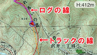紫色がGPSの線で、赤がトラックの線。 |