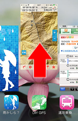 GPSログを取っているときやルート案内が動いてる時はバックグラウンド動作を行うため、iPhoneをスリープにしていてもバッテリーを消費します。ですから、お昼ご飯など長い休憩の時はDIY GPSを終了しておくと電池の節約になります(ただし、休憩中のログも取りたいのであれば終了しないでください)。 アプリを終了しちゃってログは大丈夫か?案内中のルートは?という疑問もあるでしょう。 はい、どちらも大丈夫です。DIY GPSは常に状態を保存していますので、アプリを終了しても再度起動すれば同じ状態で動きます。ですから安心してアプリを終了してください。 終了の仕方は左の説明の通りです。ホームボタンをダブルタップしてタスクマネージャを表示、アイコンを長押しして終了マークが出たらそれをタップしてください。 注意点は、休憩が終わって再出発するときにDIY GPSを忘れずに起動する事。DIY GPSを終了したまま出発するとその部分のログが飛んでしまいます。お気を付け下さい。 |