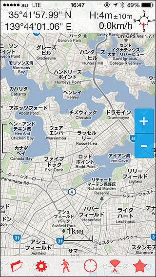 シドニーの地図を設定した様子。日本で表示してるので現在地ポインタは表示されませんが、現地に行けば表示されます(右のシドニー関連リンクを参照)。 |