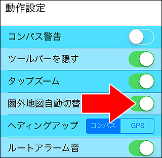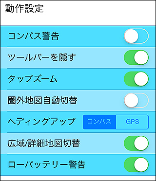 ツールバーの歯車アイコンをタップすると設定画面が開きます。ここで動作、GPSログ、表示などの設定を変えられます。 詳しくは「設定」をご覧ください。 |