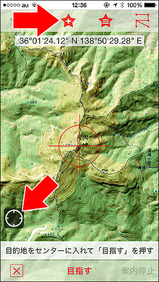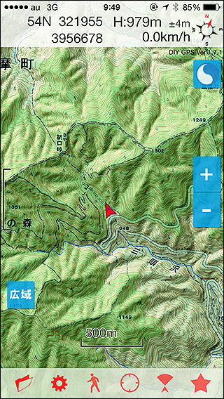 地図アプリにはよくある機能、地図にピンを立てる機能ですが実はDIY GPSにはありません。事前に計画したルートを歩いて山を登るという使い方を想定しており、その使い方に特化させるために敢えてピンの機能を入れていません。 ですが、山で動物に出会った場所や想定外の水場、崖崩れの位置を記録したい場合もあると思います。そういう時は、メイン画面のツールバー、星アイコンをタップすると出てくる「目的地設定画面」で現在地を★+ボタンを押して現在地をウェイポイントとして登録してください。 現在地を画面センターにするには、左下の現在地ボタンをタップして下さい。 現在地の座標と標高は自動で設定されるので名前だけ入力すればポイントを記録できます。次回そこに行きたいときは、★横線ボタンを押してウェイポイントを選び、「案内」を押すとメイン画面に黄色い★として表示されます(ウェイポイントによる案内中はGPSログを取っている場合と同程度バッテリーを消費しますのでご注意ください)。 複数のウェイポイントを一度に地図上に表示する機能はありませんが、ウェイポイントをルートとしてまとめてエクスポートする事が出来ますので、それをカシミール3Dで表示してマップカッターで切り出せばピンが打たれた地図を手に入れる事も可能です。 若干不便ではありますが、工夫次第でポイントを記録する事も可能という事で、ひとつよろしくお願いいたします。 |