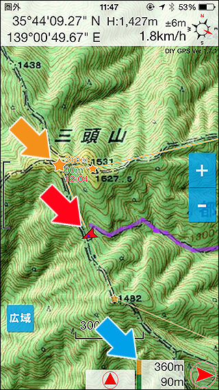 山を登っていて気になるのは、山頂や山小屋、分岐まで残りどれくらいか?という事です。あとどのくらい頑張ればいいのか判ればやる気が出るかも知れませんし、時間的に無理と判れば撤退の判断も出来ます。 DIY GPSは指定した目的地までの距離や標高差を常に表示する機能を持っています。左の画像、黄色い矢印の先にある黄色い★は現在目指している場所です。赤い矢印の先にある赤いカーソルは現在地を示しています。そして青い矢印の先に表示されているのは目的地までの距離と標高差、方向です。上の360mが直線距離で、下の90mが現在地との標高差となります(下りではマイナス表記になります)。 このような距離表示をさせる方法は3種類あります。 1.目的地設定 2.ウェイポイントを使った場合 3.ルートを使った場合 ウェイポイント案内とルート案内はちょっと複雑な機能です。使いこなすにはコチラの解説『ルート案内』をよくお読みください。 ちゃんと使えればなかなか強力な機能です。是非お使い下さい。 |