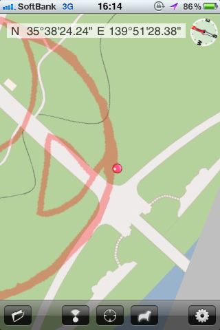 ![]() 簡単にGPS地上絵を作れるはず、です。地図回転モードで表示すれば、広場など目印がない場所でも地上絵を描きやすいです。 |