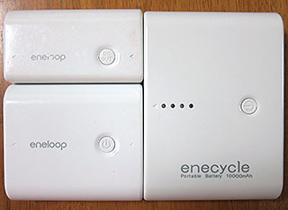 各種携帯充電器。容量が大きい物は重くなります。 |